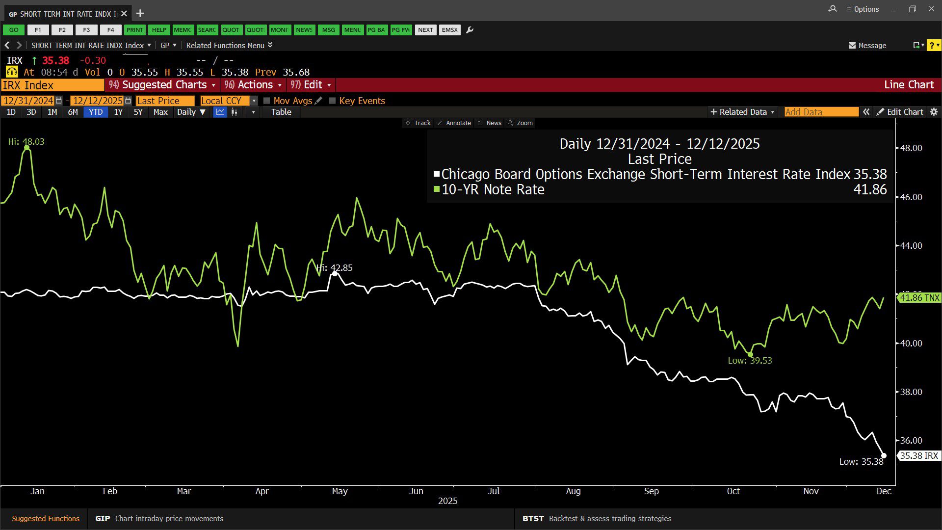 C.B.O.E. Short Term Interest Rate Index & 10 Year Treasury Note Index – Daily (12/31/2024 – 12/12/2025)