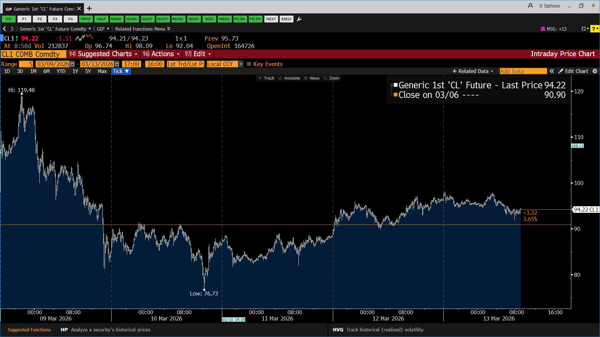 WTI Crude Oil: 5-Day Intraday Price Action (3/9/2026 – 3/13/2026)