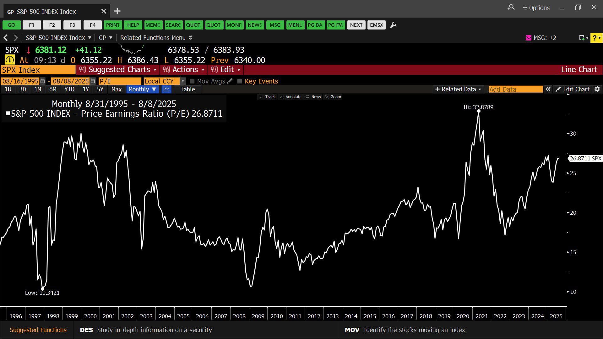 S&P 500 Index – Price Earnings Ratio, Monthly (08/16/1995 – 08/08/2025)