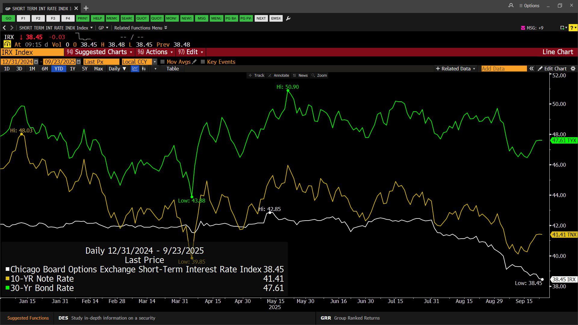 Chicago Board Options Exchange Short Term Interest Rate Index, 10 Year Note Rate Index & 30 Year Bond Rate Index – Daily (12/31/2024 – 09/23/2025)
