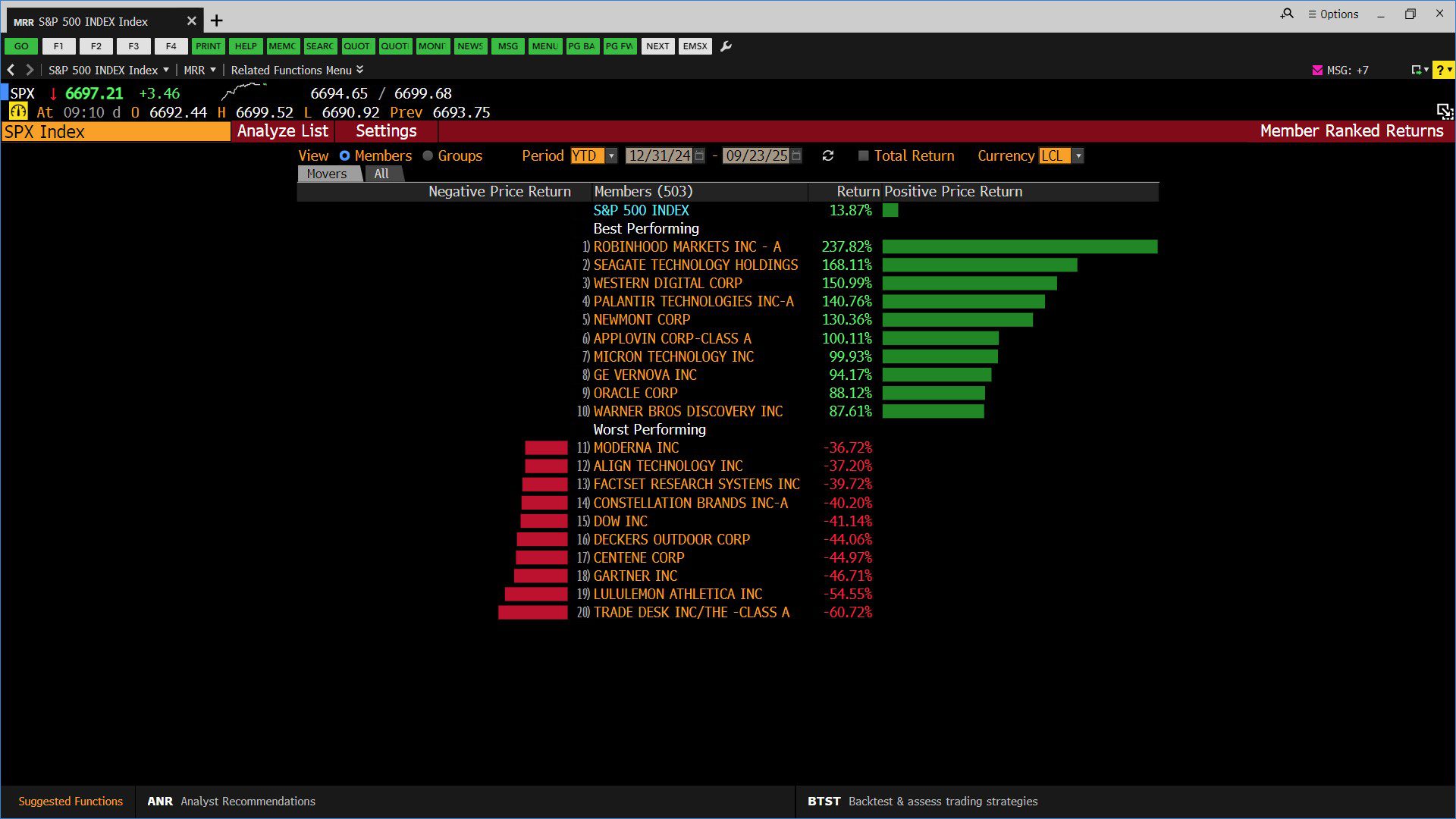 S&P 500 Index – Member Ranked Returns, Year to Date (12/31/2024 – 09/23/2025)